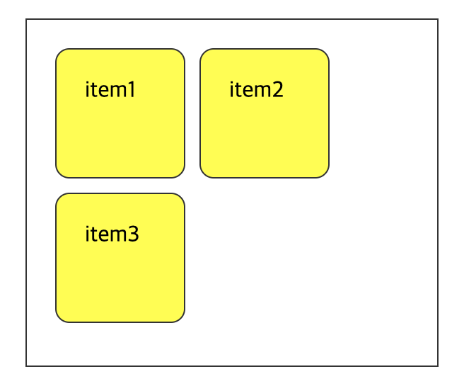 .container { width: 250px; display: flex; flex-wrap: wrap; } .items { width: 50px; height: 50px; background-color: yellow; border: 1px solid #333; border-radius: 10px; margin: 0 10px 10px 0; }